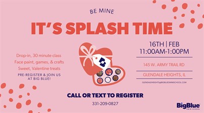 Be Mine, It’s Splash Time! Join Big Blue Swim School on your day off for a fun Valentine’s Day themed Event! Bring the kiddos to enjoy a 30 minute group lesson, fun games, face painting, give aways and a sweet treat! All are welcome… This event is most suited for kids three to 12 years old. Current customers bring your friends to experience all the fun at our facility to get a special thank you! Please stop in and register for the event to receive your Special Event Gift Card and secure your spot!
